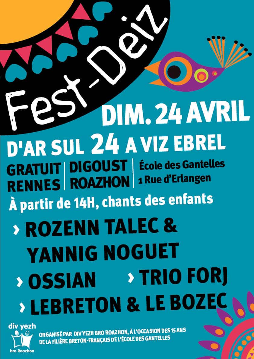 A l’occasion des 15 ans de la filière bilingue breton-français de l’école Gantelles, l’association divyezh vous propose de venir danser, faire la fête et écouter les groupes suivants :